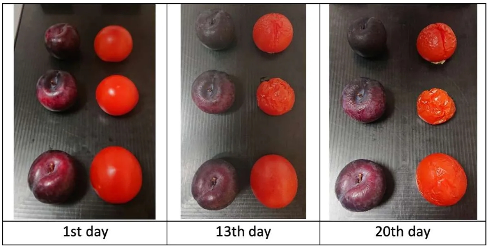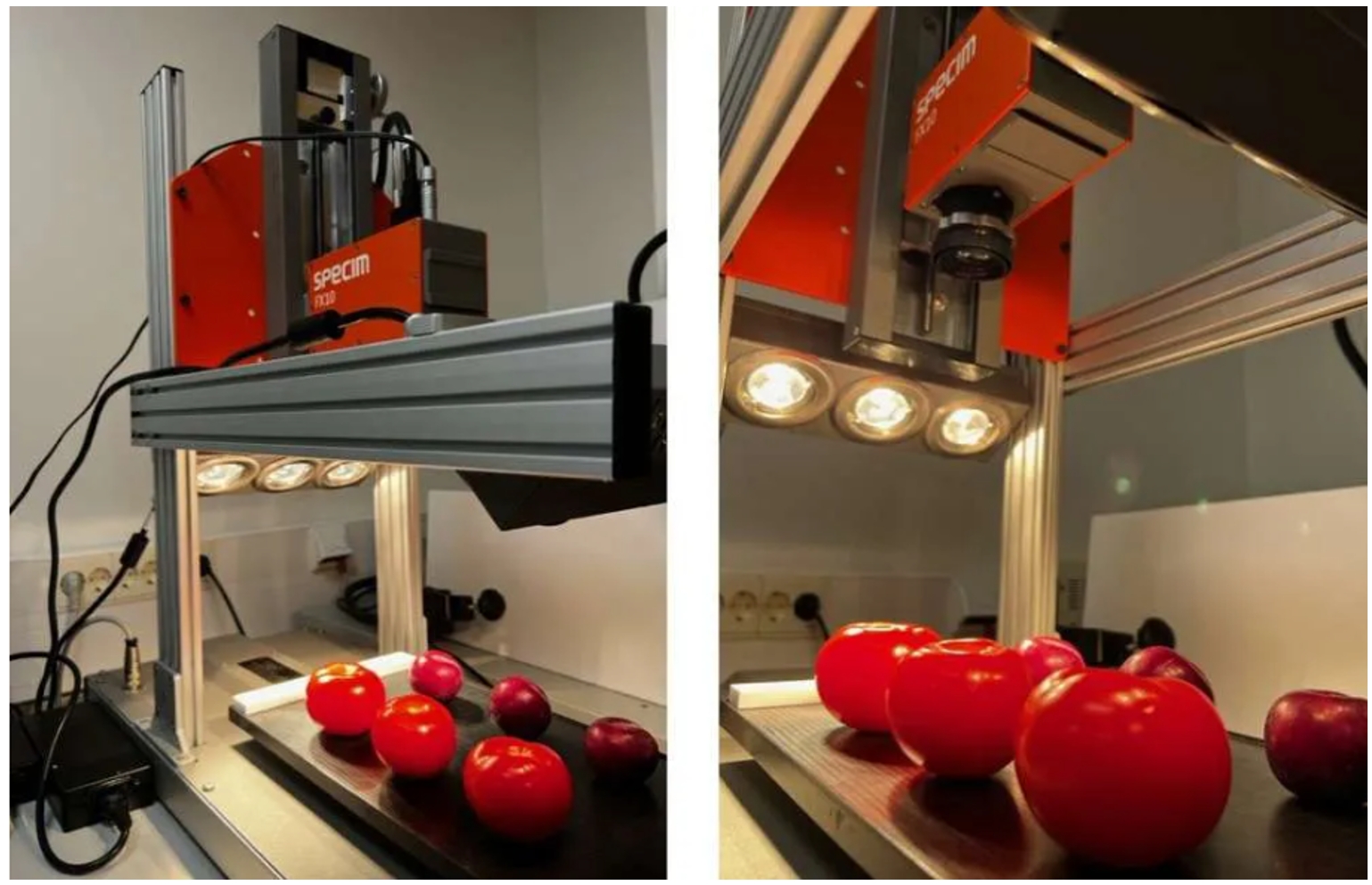 圖1:將三個李子和番茄樣本放置在實驗室掃描儀上,并使用Specim FX10相機(jī)測量了20天