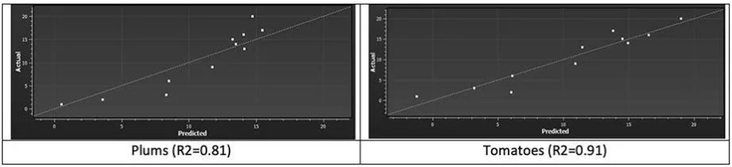 圖5:兩個模型的實際值與模型預(yù)測(測量李子和番茄的新鮮度)