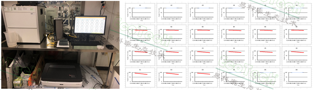 右圖:24通道的種子耗氧曲線(藍(lán)色曲線為空白對(duì)照,紅色曲線為不同處理的測(cè)試種子)